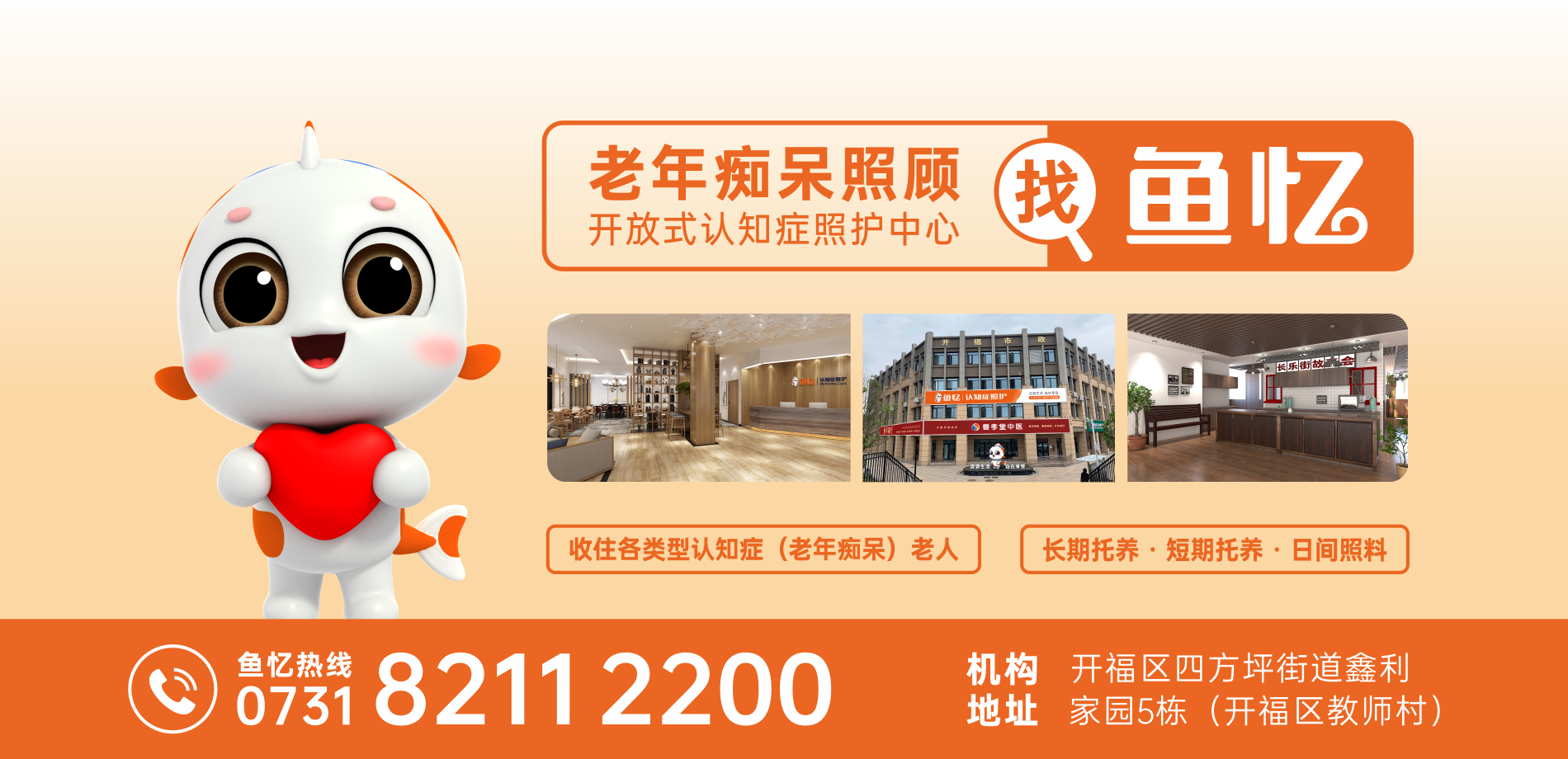 鱼忆认知症长者照护中心是湖南善孝堂养老服务有限公司旗下的专业认知症长者照护养老机构,总面积3000余平,设计养老床位100张,机构以“自游生活,自在享受”为理念,设置洄游走道、怀旧空间、家庭单元、空中花园、康复空间、认知训练区等功能区域,布置影院、邮局、车站、茶馆、开放式厨房等多种生活场景,能够满足各类型认知症长者的生活照护需求。 中心首推“开放式照护”模式,以4+2服务为基础,结合智能化穿戴设备,能够捕捉到认知症长者的生活习惯,便于为长者提供个性化的照护服务。配备医生、护士、社工、康复师、理疗师、心理咨询师、营养师、养老护理员等高学历专业化的年轻服务团队,可全方位对入住长者开展康复理疗、中医调理、心理咨询、认知筛查、认知训练等精细化健康管理养老服务;我们始终坚持用心服务和亲情管理,让认知症老人安心、舒心、自由自在的享受晚年生活。