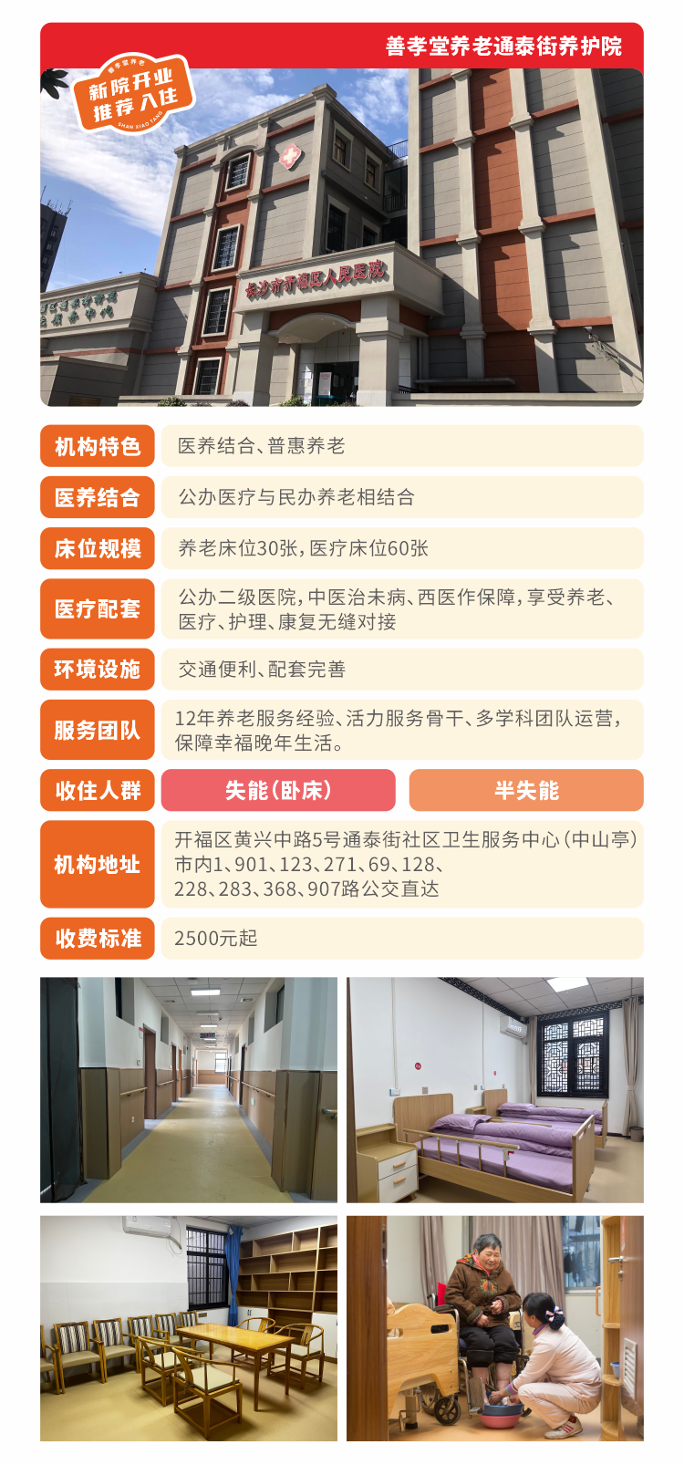 通泰街善孝堂养护院是与通泰街街道卫生服务中心(开福区人民医院)合作打造的社区嵌入式养老服务机构,位于长沙市开福区通泰街街道卫生服务中心四楼,地处市中心,紧邻五一商圈,交通便利、服务设施完善。街道卫生服务中心配套门诊部、住院部、中医康复区、公卫中心,机构建筑面积约1000平方米,养老床位30张,医疗床位60张。主要为高龄、失能老人提供专业医养结合养老服务。