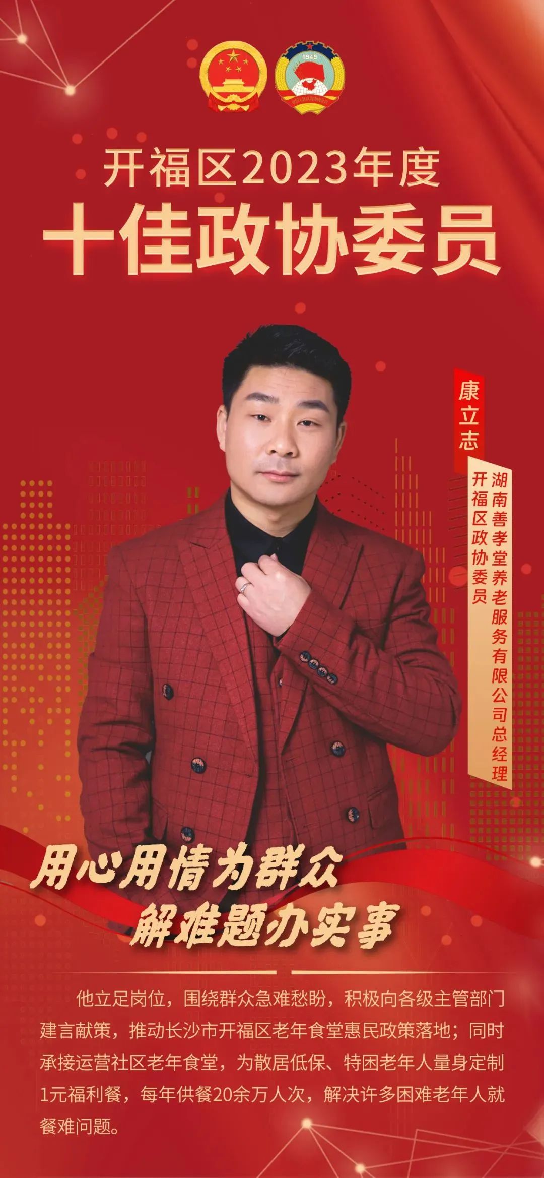 表彰提到,“他立足岗位,围绕群众急难愁盼,积极向各级主管部门建言献策,推动长沙市开福区老年食堂惠民政策落地;同时承接运营社区老年食堂,为散居低保、特困老年人量身定制1元福利餐,每年供餐20余万人次,解决许多困难老年人就餐难问题。”