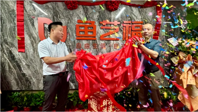 仪式于上午10:28分准时开始,万众瞩目的揭牌环节,康立志董事长与宁乡市善孝堂养老服务有限公司项目总监刘宁行至覆盖着红绸幕布的公司铭牌前,伴随着全场整齐倒计时声,两位共同拉开,红绸应声滑落,崭新的“鱼艺福”标识正式亮相。